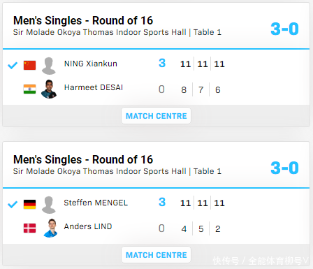 小将罗杰乘以3-0投降人尼日利亚选手库杜斯-奥拉德乔三局比分为:11-9、11-8、11-9。小将康有德以3-0横扫人尼日利亚选手约书亚-奥拉迪兰,三局比分为:11-3、11-5、13-11。