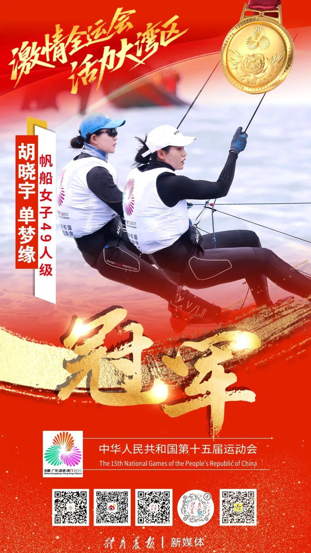 10月29日下昼,十五运风帆帆板比赛的六个风帆款式在广东省汕尾市红海湾海域圆满收帆。山东风帆队取得1金1铜。其中,亚运会冠军组合胡晓宇、单梦缘加冕风帆女子49东谈主级冠军。刘添、丁铭良获取风帆须眉49东谈主级季军。