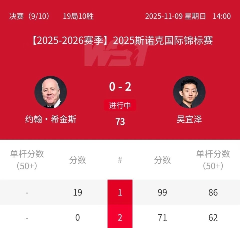 北京时辰11月9日音问,2025年斯诺克外洋锦标赛伸开终极决战。这场决赛,由中国名将吴宜泽挑战4届世锦赛冠军“巫师”约翰-希金斯。第一局,吴宜泽以99-19先下一城,1-0强势开局,接下来又赢得2-0寥落上风。稍早前的半决赛,吴宜泽以9-6慑服本年世锦赛冠军赵心童。