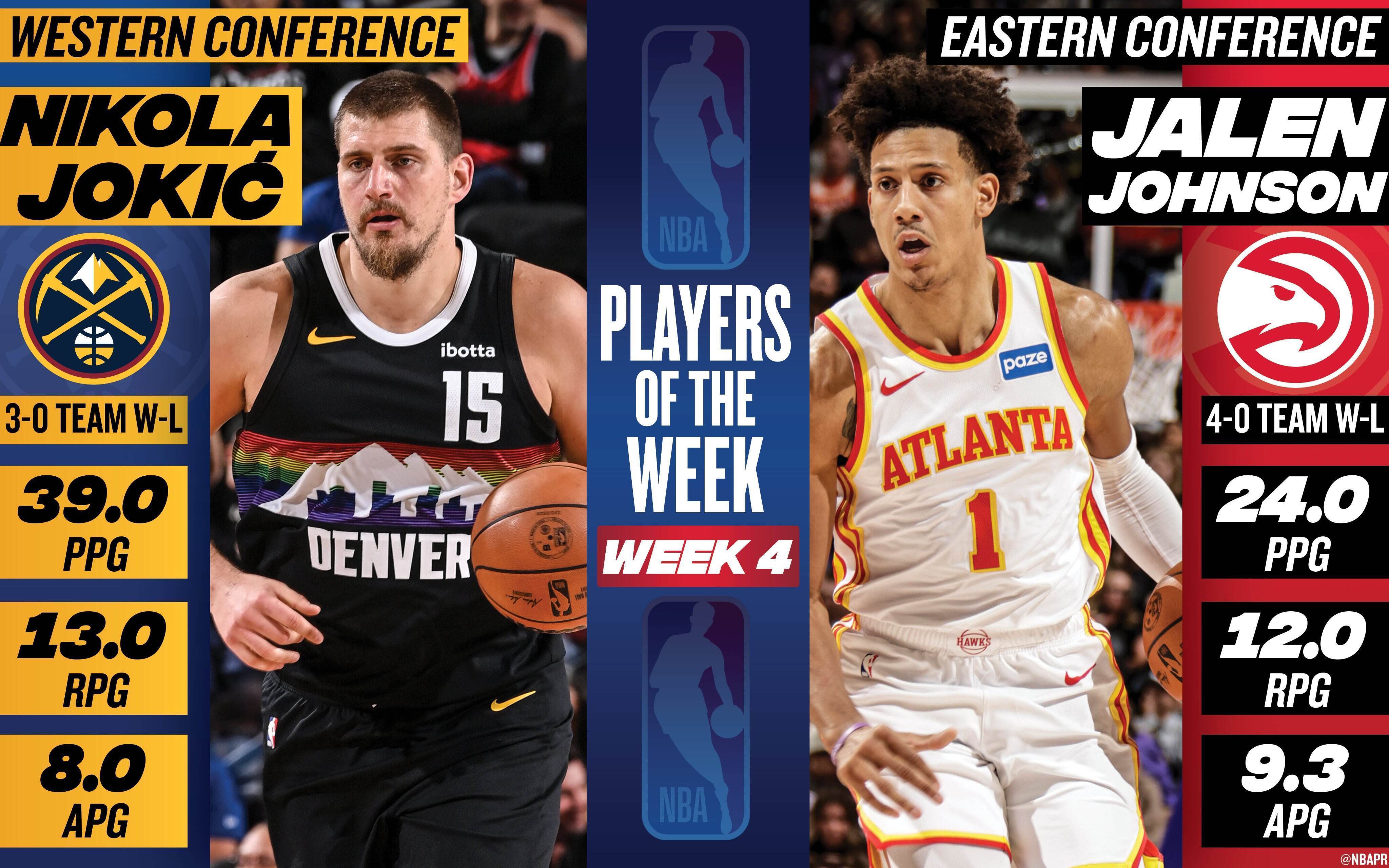 北京时分11月18日,NBA官方公布了第四周东西部周最好球员,掘金住持球星尼古拉-约基奇和老鹰新星杰伦-约翰逊区别当选。