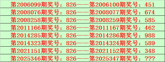陈列三第2025346期开出奖号826,该号码直选类型历史上出现了8次,前7次开出之后期下期奖号为:451、674、585、462、988、589、348,见下表:
